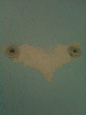 Bien, ahora para no dejar múltiples agujeros del tamaño del pulgar en las habitaciones, vamos a dejarlo todo mucho más bonito lleno de parches blancos encima de la pintura azul y verde. Precioso todo. Sí, me tocará pintar. No sé cómo quedará el efecto "pared de gotelé, parche liso de Aquaplast" pero... Mi madre me dice que pase de hacer gotelé en los parches y yo que soy muy obediente... La habitación azul pasará a ser gris y la verde, roja, por lo que me tocará dar al menos dos capas. Por supuesto pondré fotos del despiporre, vosotr@s tranquilos xD